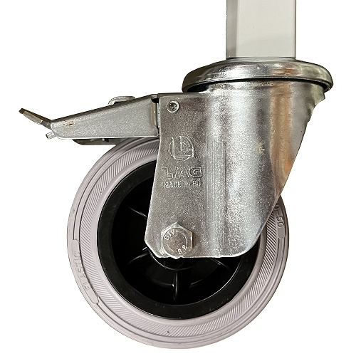 - Neljä kääntyvää harmaakumipyörää Ø 100 mm, 2 pyörää jarrula.