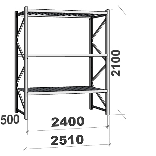 The kit includes 2 side frames 2100x500 and 3 shelf levels 2400x500 with two horizontal beams and 22 mm chipboard plate.